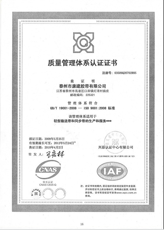 泰州市康建膠帶有限公司經(jīng)過(guò)十多年的發(fā)展已經(jīng)成為一家從事輸送帶和傳動(dòng)帶類及相關(guān)設(shè)備生產(chǎn)和銷售的公司。位于中國(guó)經(jīng)濟(jì)發(fā)達(dá)的長(zhǎng)三角經(jīng)濟(jì)圈江蘇省泰州市高港區(qū),交通發(fā)達(dá)。我司以“合格的產(chǎn)品,滿意的服務(wù)”為宗旨,發(fā)揚(yáng)團(tuán)結(jié)、開(kāi)拓、拼搏爭(zhēng)先的創(chuàng)業(yè)精神,“康建”在全國(guó)行業(yè)樹(shù)立了良好的企業(yè)形象。“康建”產(chǎn)品已通過(guò)ISO9001國(guó)際質(zhì)量體系認(rèn)證,從原料﹑工藝等方面進(jìn)行了嚴(yán)格的控制,從而確保了產(chǎn)品質(zhì)量的穩(wěn)定可靠,成為各......